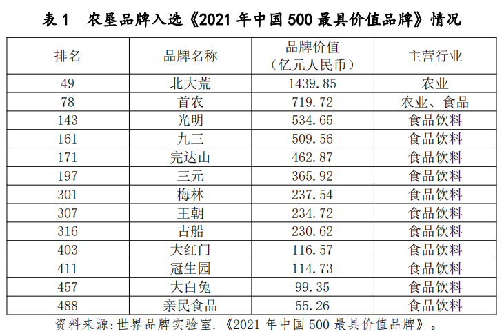 通過(guò)近幾年農(nóng)墾系統(tǒng)各單位的合力打造和培育,社會(huì)對(duì)農(nóng)墾的整體認(rèn)知不斷提升,一批有實(shí)力的墾區(qū)集團(tuán)品牌、企業(yè)品牌在農(nóng)業(yè)品牌發(fā)展中的地位不斷提升,農(nóng)墾系統(tǒng)形成了以中國(guó)農(nóng)墾公共品牌為核心、墾區(qū)(集團(tuán))公共品牌、企業(yè)品牌、產(chǎn)品品牌共同構(gòu)成的品牌矩陣。世界實(shí)驗(yàn)室公布的《2021年中國(guó)500最具價(jià)值品牌》中(表1),農(nóng)墾品牌有13個(gè),約占農(nóng)業(yè)、食品飲料類(lèi)別的14%。