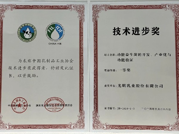 本次年會上揭曉并頒布了多項獎項榜單,光明乳業(yè)以創(chuàng)新為核打造新質生產(chǎn)力,榮獲2024乳業(yè)科技創(chuàng)新企業(yè)獎項;憑借功能益生菌的開發(fā)、產(chǎn)業(yè)化與功能驗證項目,獲得技術進步獎一等獎;同時,光明乳業(yè)旗下嬰幼兒配方乳粉獲得2023年度主流品牌嬰幼兒配方乳粉質量大賽質量金獎。