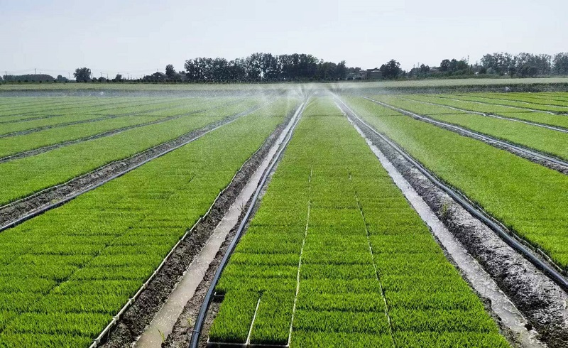 盛夏時(shí)節(jié),蘇墾農(nóng)發(fā)新洋分公司連云港灌南三口外拓基地連片秧苗綠波蕩漾,長(zhǎng)勢(shì)喜人。整齊劃一的秧池內(nèi),黑色的微噴管道噴灑出均勻細(xì)密的水霧,讓秧苗在旱地也能“喝”飽水。