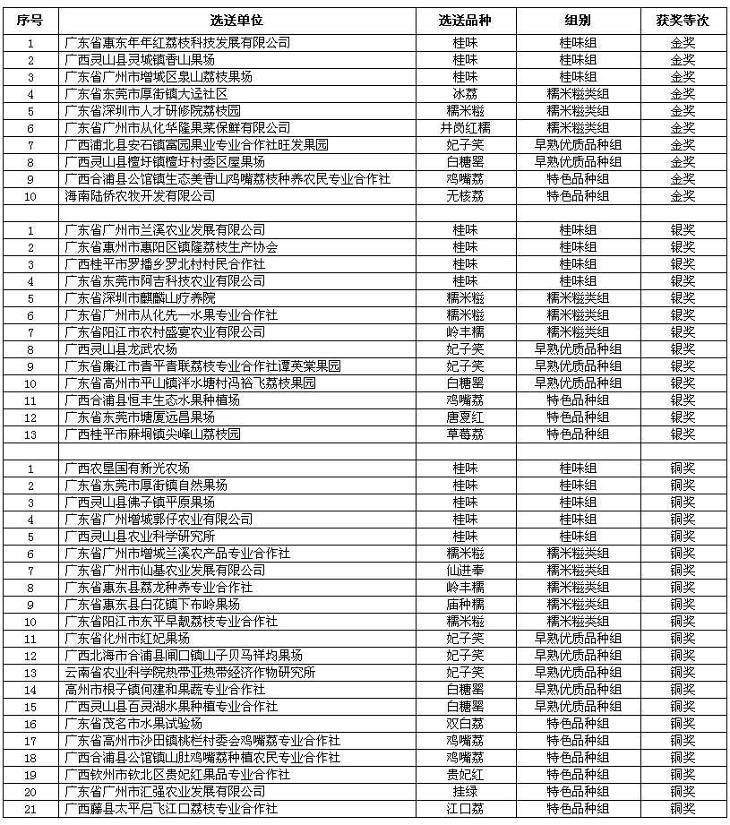 由農業(yè)農村部荔枝標準化生產示范園聯(lián)盟組織的2018年全國優(yōu)質荔枝擂臺賽,共收到參評樣品78個,按照擂臺賽評比辦法,經國家荔枝龍眼產業(yè)技術體系專家組測定,評選出金銀銅獎共44個,其中:金獎10個、銀獎13個、銅獎21個。名單公布如下: