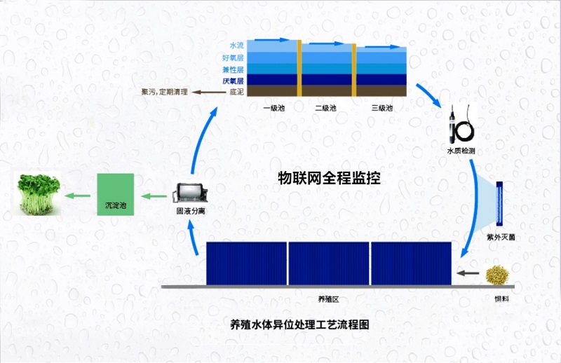 以生態(tài)池塘為依托,在岸基上搭建集裝箱養(yǎng)殖裝備進(jìn)行循環(huán)養(yǎng)殖,通過與生態(tài)池塘進(jìn)行水循環(huán),實現(xiàn)養(yǎng)殖尾水凈化。配套物聯(lián)網(wǎng)控制系統(tǒng),監(jiān)控養(yǎng)殖全過程及水質(zhì)變化、尾水處理效果等,實現(xiàn)養(yǎng)殖生產(chǎn)信息化管理。水循環(huán)的開端,先用水泵(浮臺式)將生態(tài)池塘上層富氧水不斷抽至集裝箱養(yǎng)殖設(shè)備中,并利用鼓風(fēng)機(jī)曝氣提高箱內(nèi)水體溶氧量,保障高密度集約化養(yǎng)殖。在箱體內(nèi)模擬仿生態(tài)環(huán)流,保持最優(yōu)流速,促進(jìn)魚健康生長和品質(zhì)提升。養(yǎng)殖產(chǎn)生的尾水,經(jīng)斜面集污槽排出箱外,保持箱內(nèi)水質(zhì)清潔。養(yǎng)殖尾水排出箱后,經(jīng)固液分離裝置過濾(120目篩網(wǎng),去除90%以上大顆粒雜質(zhì)),分離出的殘餌糞便可作為有機(jī)肥料;過濾后的水流入多級生態(tài)池塘,進(jìn)行尾水凈化。養(yǎng)魚過程不接觸池塘底泥,避免了土腥味,有效提升了水產(chǎn)品品質(zhì)。整個養(yǎng)殖過程不再向池塘中投喂飼料,池塘底質(zhì)不會變臟變臭,可實現(xiàn)水體循環(huán)使用,池塘從養(yǎng)殖功能轉(zhuǎn)變?yōu)樯鷳B(tài)濕地功能,實現(xiàn)了傳統(tǒng)養(yǎng)殖向休閑漁業(yè)、觀光農(nóng)業(yè)的轉(zhuǎn)型發(fā)展。