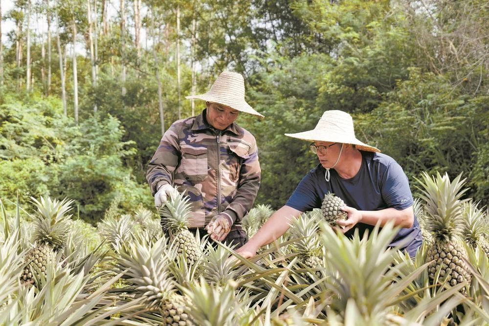 7月18日,記者走進該種植基地,只見一茬茬鳳梨長勢喜人。飽滿碩大的鳳梨頭頂綠纓,果實挺立于層層葉子之上,微風拂過,空氣中彌漫著陣陣鳳梨清香。地頭,種植戶凌長恩和村民正忙碌而有序地進行采摘、分揀、裝箱,臉上洋溢著豐收的喜悅。