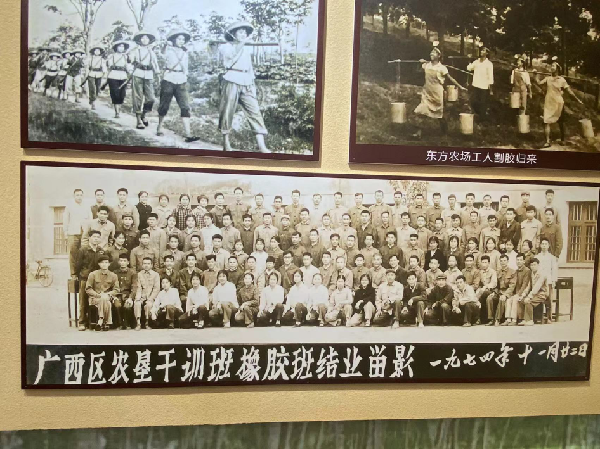 展示館重點介紹了廣西軍區(qū)生產師成立的背景及歷史沿革。記錄了1970年10月廣西軍區(qū)生產師成立,由南下干部、知識青年、解放軍戰(zhàn)士和歸僑僑眷組成的生產師在當時極為艱苦的條件下,將蠻荒之地耕耘成一個個膠園,并創(chuàng)造了在北緯17℃以北種植橡膠的世界奇跡。