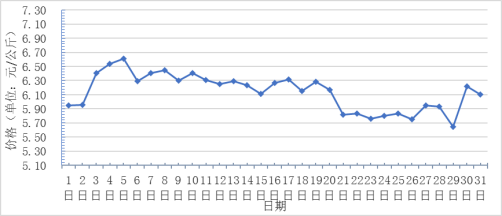 10月,全國重點監(jiān)測農產(chǎn)品批發(fā)市場香蕉總交易量達2.6萬噸,同比下降16.1%,環(huán)比上漲4%;總交易價值16145.8萬元,同比下降9.0%,環(huán)比上漲2.1%。日平均價格最高為6.6元/千克,最低為5.7元/千克,全月平均價格為6.1元/千克,同比上漲13.0%,環(huán)比下降3.2%(每日價格變化如圖)。