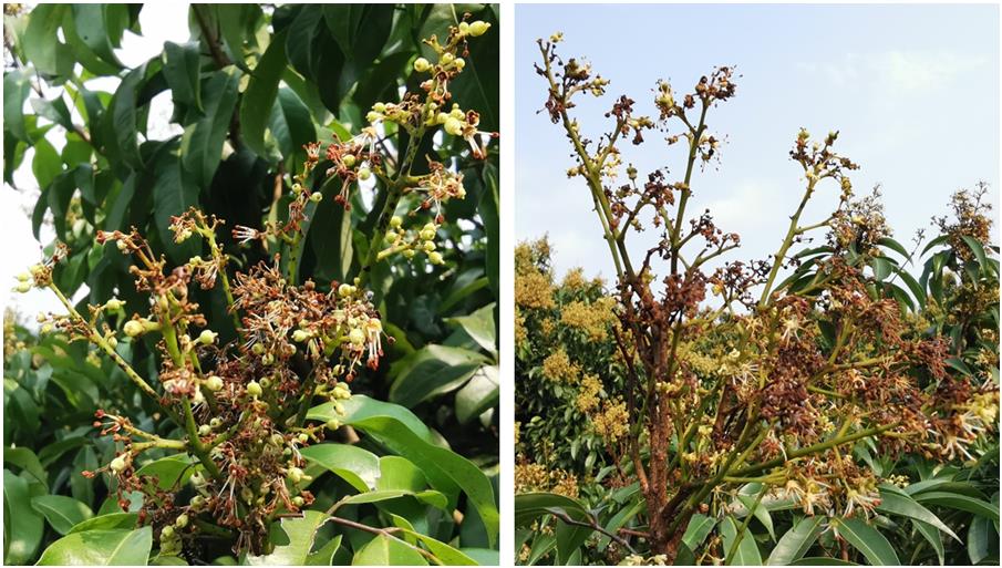 當(dāng)前,廣東、廣西以及福建的大多數(shù)主栽荔枝品種處于盛花期或即將進(jìn)入盛花期。荔枝花期如同果實轉(zhuǎn)色至成熟期,易感染霜疫病和炭疽病,有效防控花期病害是確保荔枝豐收的一個重要環(huán)節(jié)。據(jù)監(jiān)測站調(diào)查,因本月中旬華南地區(qū)連續(xù)數(shù)天的陰雨天氣,導(dǎo)致部分果園的荔枝花穗感染了霜疫?。▓D1)。據(jù)中國天氣網(wǎng)22日預(yù)報,江南、華南一帶的強對流天氣出場頻率明顯增加,預(yù)計3月下旬南方還將有兩次降雨過程,分別在24日夜間至27日以及29日前后,降水量較常年同期偏多。監(jiān)測站和荔枝主產(chǎn)區(qū)生產(chǎn)主管部門要積極開展監(jiān)測,指導(dǎo)果農(nóng)及時開展防控。