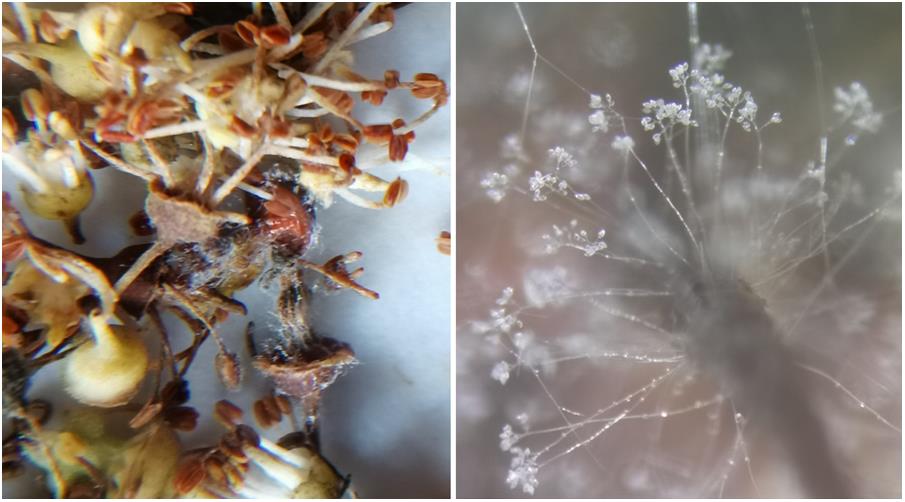 圖2 室溫下保濕一晚荔枝小花上長出的白色霉?fàn)钗铮ㄗ螅┘安≡敝丑w(右)