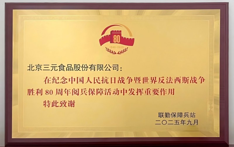 作為首都國企,三元食品一直是北京重大文體科技等活動的“常駐伙伴”。此次閱兵自活動籌備啟動以來,三元食品以最高標(biāo)準(zhǔn)、最佳狀態(tài),全方位、全身心投入。在保障過程中,從生產(chǎn)研發(fā)、物流配送,到人員管理、軍企協(xié)同,各環(huán)節(jié)緊密配合,嚴守安全底線,于細微處精益求精。全體員工堅守崗位、全力以赴,以高度的政治責(zé)任感與職業(yè)精神,為閱兵提供乳制品營養(yǎng)保障。此次閱兵三元食品圓滿完成保障使命,以匠心品質(zhì)為閱兵盛典貢獻力量。