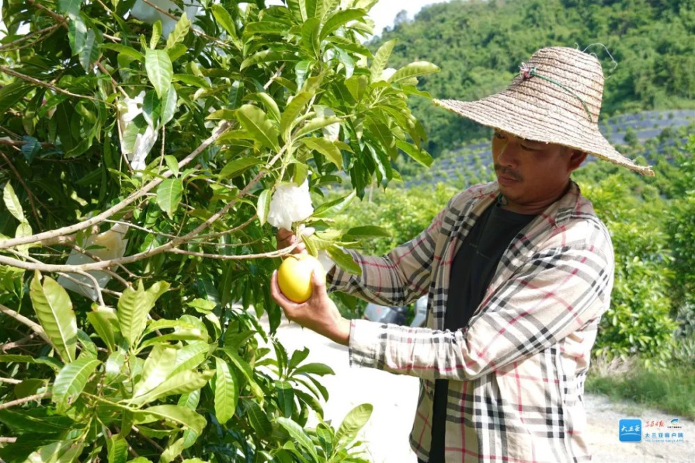 “輕拿輕放,小心刮傷果皮!”8月4日下午,在天涯區(qū)南島社區(qū)的一隅山坡上,綠意盎然。工人們穿梭于成排的果樹間,小心翼翼地采摘著一個個被白色套袋精心包裹的黃晶果。