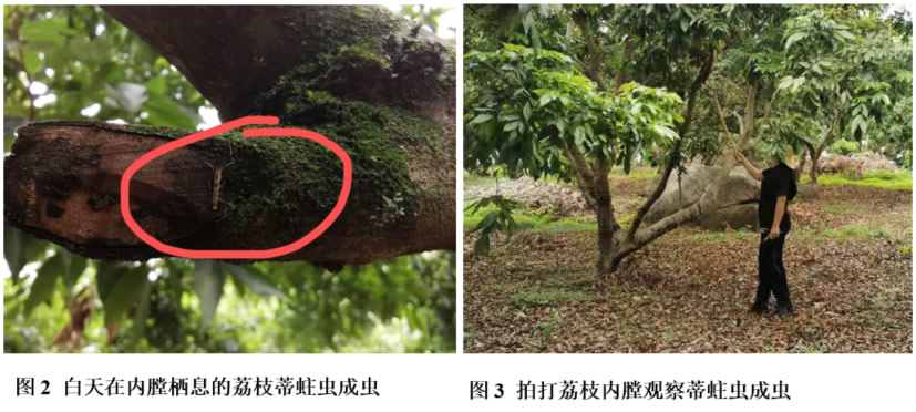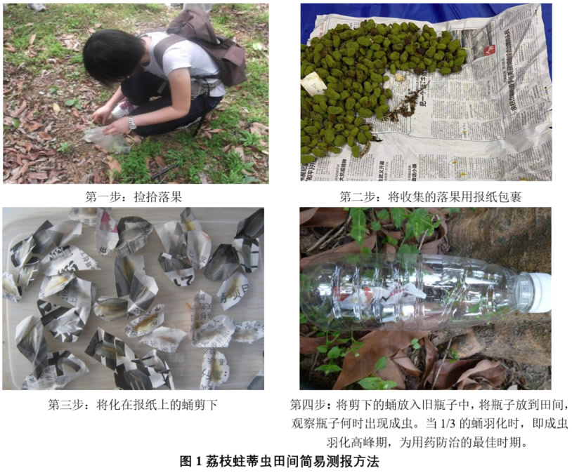 一、監(jiān)測(cè)方法:1.監(jiān)測(cè)落果中荔枝蒂蛀蟲(chóng)的發(fā)育進(jìn)度,預(yù)測(cè)蒂蛀蟲(chóng)成蟲(chóng)羽化高峰期。根據(jù)蒂蛀蟲(chóng)田間簡(jiǎn)易測(cè)報(bào)方法(如圖1),連續(xù)7-10天撿拾地下落果,收集并用一層報(bào)紙包裹,數(shù)日后剪下在報(bào)紙化蛹的荔枝蒂蛀蟲(chóng)(蛹),置于空礦泉水瓶中,待瓶中有1/3的蛹羽化為成蟲(chóng),即為成蟲(chóng)羽化高峰期,可用藥防治。2.監(jiān)測(cè)樹(shù)干上荔枝蒂蛀蟲(chóng)成蟲(chóng)。根據(jù)蒂蛀蟲(chóng)成蟲(chóng)白天棲于陰涼的樹(shù)冠內(nèi)枝桿上(如圖2),受到驚嚇時(shí)會(huì)飛離枝桿這一特性,于每天清晨對(duì)果園進(jìn)行實(shí)地調(diào)查,每個(gè)果園按東南西北中五個(gè)方位進(jìn)行定點(diǎn)監(jiān)測(cè),每個(gè)方位取10-15株樹(shù),在荔枝內(nèi)膛拍打莖桿(如圖3),發(fā)現(xiàn)有成蟲(chóng)時(shí),即可用藥防治。