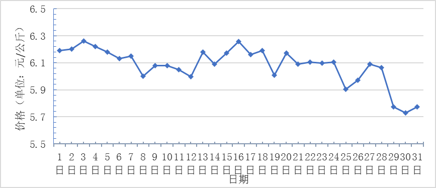 8月,全國重點監(jiān)測農(nóng)產(chǎn)品批發(fā)市場香蕉總交易量達(dá)2.3萬噸,同比下降50%,環(huán)比上漲9.5%;總交易價值 14507萬元,同比下降50.5%,環(huán)比上漲6.6%。日平均價格最高為6.3元/千克,最低為5.7元/千克,全月平均價格為6.1元/千克,同比上漲7%,環(huán)比下降10.3%(每日價格變化如圖)。