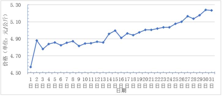 8月,全國重點監(jiān)測農(nóng)產(chǎn)品批發(fā)市場香蕉總交易量達8.6萬噸,同比上漲11.7%,環(huán)比上漲10.3%;總交易價值 41886.5萬元,同比上漲27.1%,環(huán)比上漲13.4%。日平均價格最高為5.2元/公斤,最低為4.6元/公斤,全月平均價格為5元/公斤,同比上漲13.6%,環(huán)比上漲6.4%(每日價格變化如圖)。