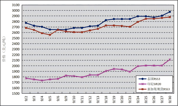 國(guó)外主產(chǎn)區(qū):9月,泰國(guó)RSS3平均價(jià)格為2783美元/噸,環(huán)比上漲381美元/噸,最高價(jià)為2975美元/噸,最低價(jià)為2655美元/噸;印尼SIR20平均價(jià)格為1879美元/噸,環(huán)比上漲151美元/噸,最高價(jià)為2115美元/噸,最低價(jià)為1735美元/噸;新加坡RSS3期貨主力合約月均結(jié)算價(jià)格為2705美元/噸,環(huán)比上漲325美元/噸,最高價(jià)為2880美元/噸,最低價(jià)為2560美元/噸。