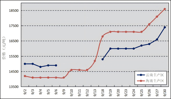國(guó)內(nèi)主產(chǎn)區(qū):9月,海南、廣東部分產(chǎn)區(qū)受強(qiáng)臺(tái)風(fēng)侵襲,云南產(chǎn)區(qū)持續(xù)降雨,原料供應(yīng)緊張,帶動(dòng)收購(gòu)價(jià)格大幅走高。云南產(chǎn)區(qū)因降雨未統(tǒng)計(jì)部分日期原料價(jià)格。云南、海南鮮膠乳(折干膠)月均價(jià)格分別為15743元/噸、15805元/噸,環(huán)比上漲1898元/噸、1991元/噸。