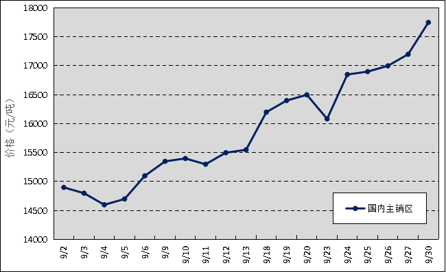 國(guó)內(nèi)主銷區(qū):9月,上海、青島和天津等銷區(qū)市場(chǎng)的國(guó)產(chǎn)全乳標(biāo)準(zhǔn)膠平均價(jià)格為15899元/噸,環(huán)比上漲1381元/噸,最高價(jià)為17750元/噸,最低價(jià)為14600元/噸。