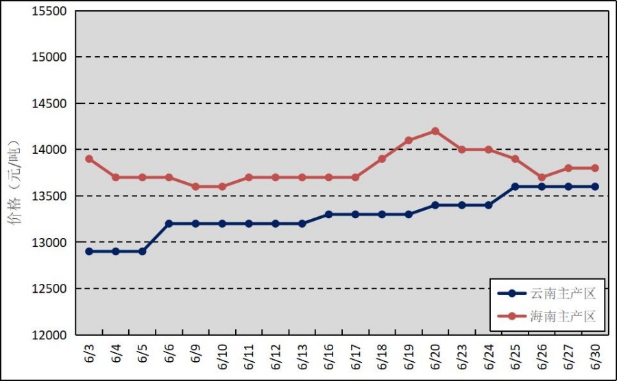 國(guó)內(nèi)主產(chǎn)區(qū):6月上旬,海南產(chǎn)區(qū)受降水天氣擾動(dòng)疊加臺(tái)風(fēng)影響,原料產(chǎn)出受阻,收購(gòu)價(jià)格小幅上漲。下旬,由于濃乳現(xiàn)貨市場(chǎng)高價(jià)成交不佳,加工廠生產(chǎn)利潤(rùn)空間遭到擠壓,膠水收購(gòu)價(jià)格重心小幅下滑。云南、海南鮮膠乳(折干膠)月均價(jià)格分別為13285元/噸、13805元/噸。