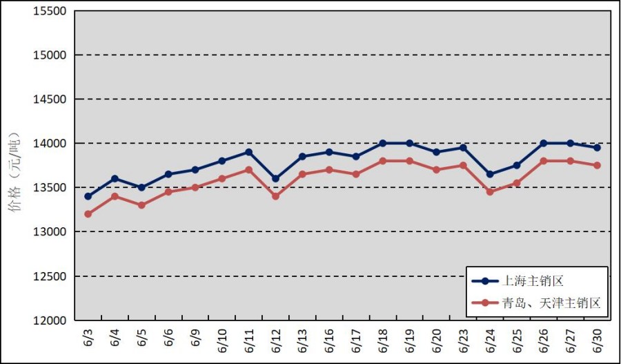 國(guó)內(nèi)主銷區(qū):6月,國(guó)產(chǎn)全乳標(biāo)準(zhǔn)膠上海市場(chǎng)平均價(jià)格13798元/噸,環(huán)比下跌776元/噸,最高價(jià)為14000元/噸,最低價(jià)為13400元/噸;青島市場(chǎng)和天津市場(chǎng)平均價(jià)格13598元/噸,環(huán)比下跌760元/噸,最高價(jià)為13800元/噸,最低價(jià)為13200元/噸。