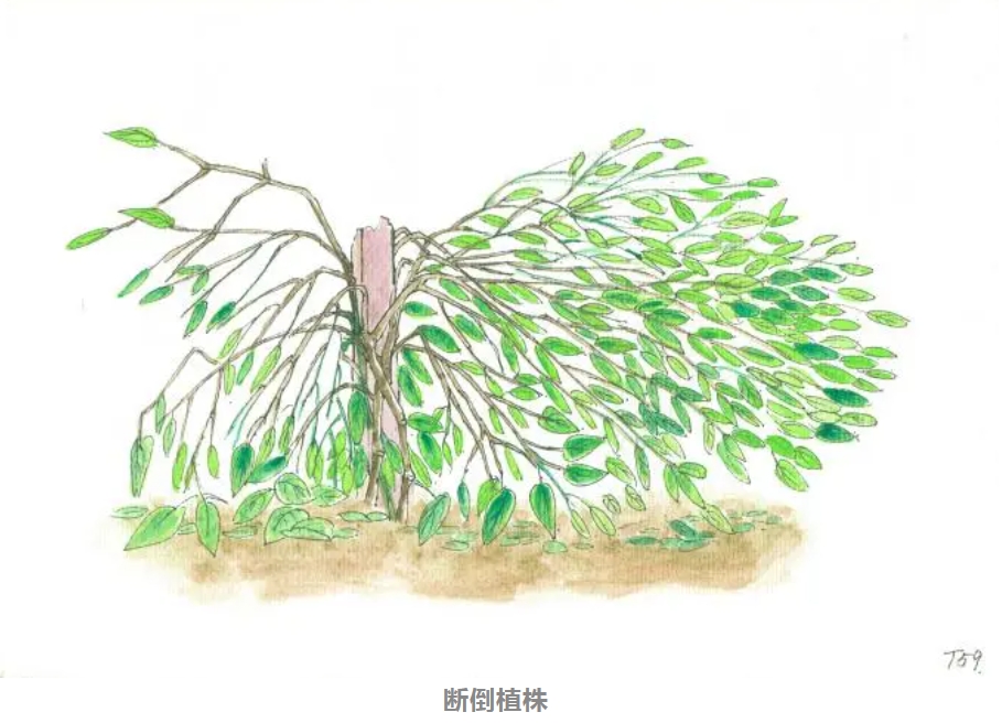 臺(tái)風(fēng)風(fēng)力大小差異對(duì)胡椒造成的損害也各不相同,主要會(huì)導(dǎo)致胡椒落葉、落花、落果,枝條損傷;脫頂,脫柱;斷柱,倒伏等。