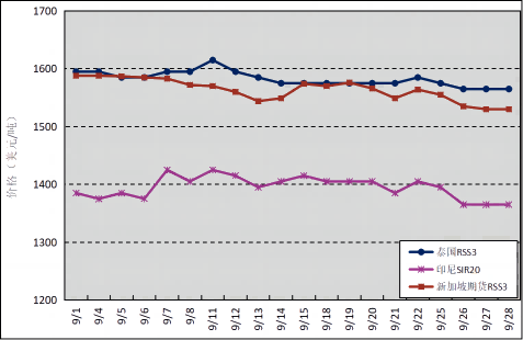 國(guó)外主產(chǎn)區(qū):9月,泰國(guó)RSS3平均價(jià)格為1583美元/噸,環(huán)比上漲87美元/噸,最高價(jià)為1615美元/噸,最低價(jià)為1565美元/噸;印尼SIR20平均價(jià)格為1395美元/噸,環(huán)比上漲130美元/噸,最高價(jià)為1425美元/噸,最低價(jià)為1365美元/噸;新加坡RSS3期貨主力合約月均結(jié)算價(jià)格為1564美元/噸,環(huán)比上漲85美元/噸,最高價(jià)為1588美元/噸,最低價(jià)為1530美元/噸。