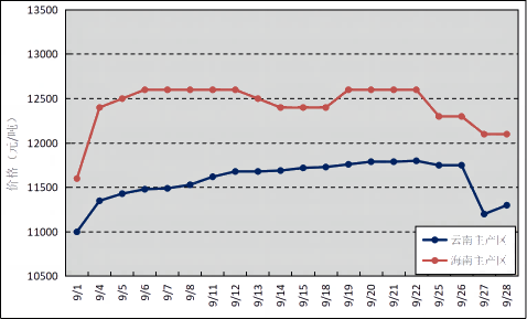 國(guó)內(nèi)主產(chǎn)區(qū):9月,國(guó)內(nèi)產(chǎn)區(qū)受反復(fù)降雨天氣影響,割膠工作進(jìn)程放緩,膠水產(chǎn)出偏少,拉漲原料價(jià)格。云南和海南原料膠(折干膠)月均價(jià)格分別為11577元/噸、12420元/噸,環(huán)比上漲1068元/噸、1718元/噸。
