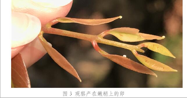 當(dāng)荔枝樹進(jìn)入抽梢期時(shí),對(duì)果園進(jìn)行實(shí)地調(diào)查,每個(gè)果園按東南西北中五個(gè)方位進(jìn)行定點(diǎn)監(jiān)測(cè),每個(gè)方位取5株樹,每株樹隨機(jī)取5~10個(gè)枝條,觀察荔枝嫩梢上的卵數(shù)量(圖3),當(dāng)卵數(shù)量達(dá)30%時(shí),3~4天后則施藥進(jìn)行防治。