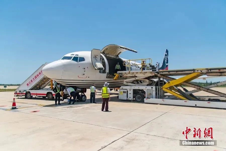 圖為??谥辽钲谕诞a(chǎn)地直發(fā)的荔枝貨機(jī)專線。??诿捞m國際機(jī)場供圖