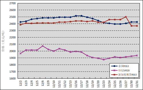 國外主產(chǎn)區(qū):12月,泰國RSS3平均價格為2457美元/噸,環(huán)比上漲96美元/噸,最高價為2515美元/噸,最低價為2395美元/噸;印尼SIR20平均價格為1965美元/噸,環(huán)比上漲60美元/噸,最高價為2075美元/噸,最低價為1875美元/噸;新加坡RSS3期貨主力合約月均結(jié)算價格為2424美元/噸,環(huán)比上漲108美元/噸,最高價為2500美元/噸,最低價為2368美元/噸。