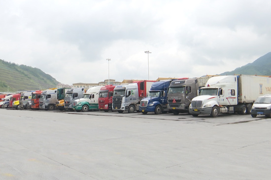 滿載水果的貨車等待海關(guān)查驗