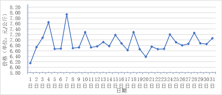 10月,全國重點(diǎn)監(jiān)測農(nóng)產(chǎn)品批發(fā)市場香蕉總交易量達(dá)2.3萬噸,同比上漲9.5%,環(huán)比下降11.5%;總交易價(jià)值15349.4萬元,同比上漲11.9%,環(huán)比下降4.9%。日平均價(jià)格最高為8.0元/千克,最低為6.2元/千克,全月平均價(jià)格為 6.9元/千克,同比上漲3.0%,環(huán)比上漲13.1%(每日價(jià)格變化如圖)。