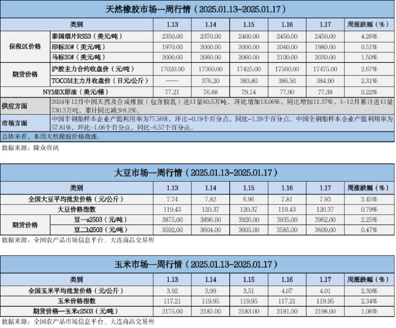 天然橡膠、大豆、玉米市場(chǎng)一周行情(2025.01.13-01.17)