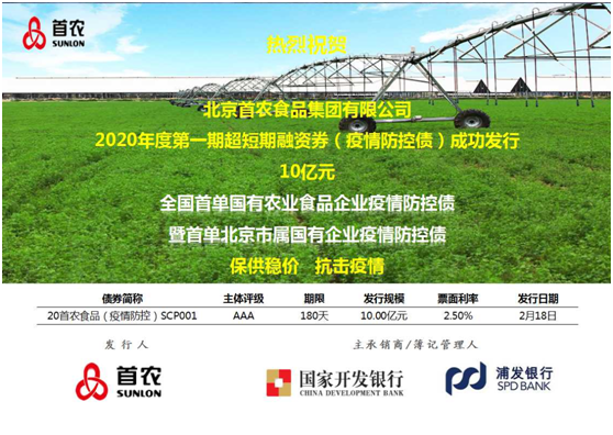 2月18日,2020年度北京首農(nóng)食品集團有限公司(以下簡稱“首農(nóng)食品集團”)第一期超短期融資券(疫情防控債)成功簿記發(fā)行。本次債券由國家開發(fā)銀行、上海浦東發(fā)展銀行聯(lián)合承銷,募集資金10億元,發(fā)行期限180天,發(fā)行利率2.5%,募集資金主要用于首農(nóng)食品集團下屬北京二商肉類食品集團有限公司疫情期間豬肉類產(chǎn)品的保障采購以及其他米、面、油、肉、蛋、奶、菜等食品的保障供應(yīng)。