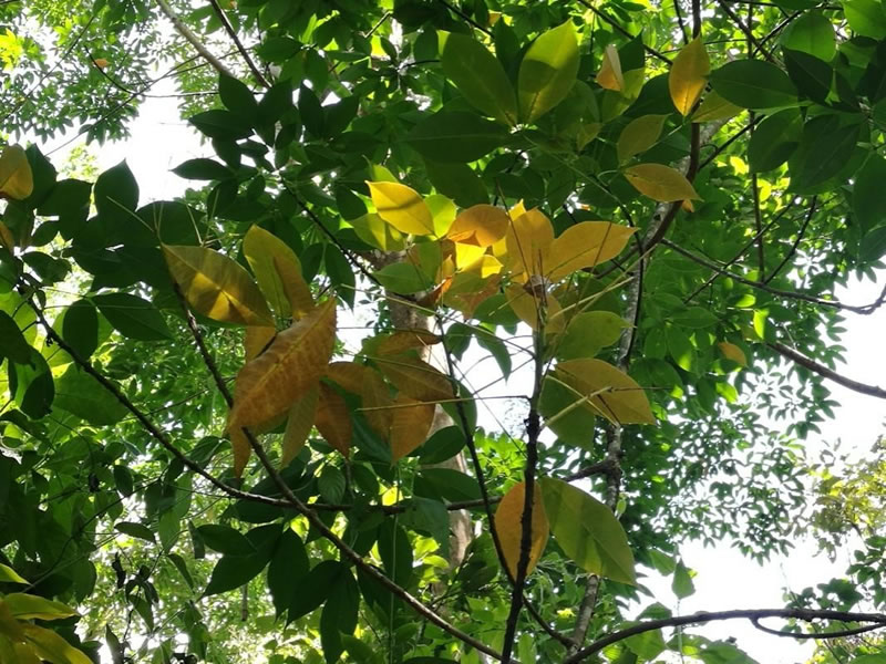 目前調(diào)查發(fā)現(xiàn)為害橡膠樹的害螨種類主要為六點(diǎn)始葉螨,部分區(qū)域有比哈小爪螨和東方真葉螨混合發(fā)生,多數(shù)膠園出現(xiàn)受害狀,蟲口密度高低不一。監(jiān)測(cè)站和專家調(diào)查發(fā)現(xiàn),云南德宏、江城及孟連部分受害區(qū)域已出現(xiàn)落葉;海南部分嚴(yán)重發(fā)生區(qū)域如樂東山榮,株受害率為100%,葉受害率69.23%,葉片黃化和落葉嚴(yán)重,蟲口密度平均為19.8頭/葉,最高達(dá)50余頭/葉;在瓊中加釵、陽江和樂東保國及儋州中國熱科院試驗(yàn)場(chǎng)、西慶、西培等區(qū)域,六點(diǎn)始葉螨危害狀較普遍,蟲口密度高者達(dá)30多頭/葉。在海南和云南調(diào)查區(qū)域,生理性黃葉較為普遍,常與橡膠樹害螨危害引起的黃葉混合出現(xiàn)。
