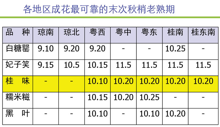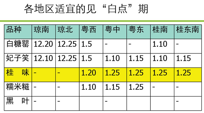 原因分析:秋冬季日照時間長、光照充足、天氣溫暖,是荔枝光合積累的黃金時期。貯藏碳水化合物除滿足成花需求之外,也供給開花和初期坐果之需。荔枝在葉片轉(zhuǎn)綠之后才能進(jìn)入凈光合狀態(tài)。以見 “白點”時間為節(jié)點,秋梢老熟時間越長,凈光合積累時間越長,積累和貯藏碳水化合物量越多。