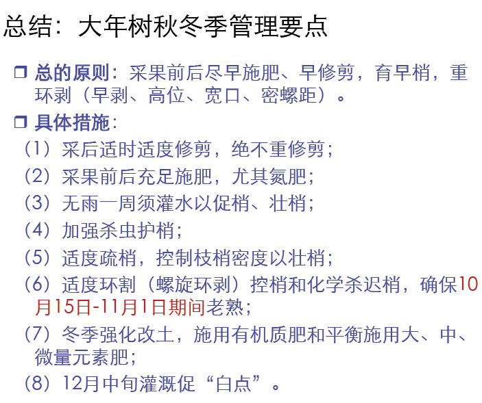 目標(biāo):末次秋梢適當(dāng)提早老熟;控制抽發(fā)冬梢;殺滅抽發(fā)的冬梢。