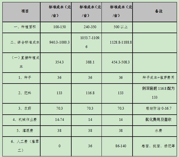 三、不同種植面積的標(biāo)準(zhǔn)成本