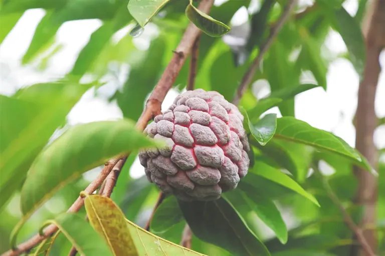 盛夏時(shí)節(jié),溫?zé)岬年柟庀?,一顆顆紫色釋迦掛滿枝頭,閃爍著玫瑰色的光亮,散發(fā)著玫瑰的香味。這是三亞育才生態(tài)區(qū)那受村引進(jìn)的“新奇特優(yōu)”水果之一,因其獨(dú)特的口感和市場的稀有,受到廣大消費(fèi)者的青睞。
