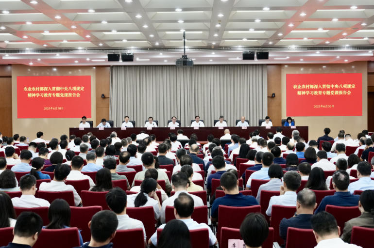 6月30日,農(nóng)業(yè)農(nóng)村部黨組召開深入貫徹中央八項(xiàng)規(guī)定精神學(xué)習(xí)教育專題黨課報(bào)告會,部黨組書記、部長韓俊作專題黨課報(bào)告,中央第四指導(dǎo)組組長車俊、副組長郝平到會指導(dǎo)。會議強(qiáng)調(diào),部系統(tǒng)各級黨組織和廣大黨員干部要深入學(xué)習(xí)貫徹習(xí)近平總書記關(guān)于加強(qiáng)黨的作風(fēng)建設(shè)的重要論述,落實(shí)中央部署和中央指導(dǎo)組要求,持續(xù)推動學(xué)習(xí)教育走深走實(shí),持之以恒深化部系統(tǒng)作風(fēng)建設(shè),營造風(fēng)清氣正的良好政治生態(tài),為推進(jìn)鄉(xiāng)村全面振興、加快建設(shè)農(nóng)業(yè)強(qiáng)國提供堅(jiān)強(qiáng)保障。
