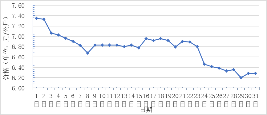 7月,全國(guó)重點(diǎn)監(jiān)測(cè)農(nóng)產(chǎn)品批發(fā)市場(chǎng)香蕉總交易量達(dá)2.1萬(wàn)噸,同比上漲5%,環(huán)比下降8.7%;總交易價(jià)值 13613.1萬(wàn)元,同比上漲6.5%,環(huán)比下降11.3%。日平均價(jià)格最高為7.4元/千克,最低為6.2元/千克,全月平均價(jià)格為 6.8元/千克,同比上漲23.6%,環(huán)比上漲1.5%(每日價(jià)格變化如圖)。