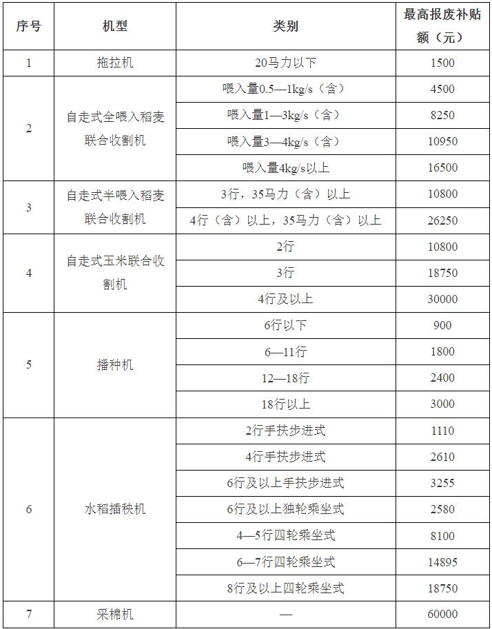 報(bào)廢20馬力以下拖拉機(jī),單臺(tái)最高報(bào)廢補(bǔ)貼額由1000元提高到1500元;報(bào)廢聯(lián)合收割機(jī)、水稻插秧機(jī)、播種機(jī)并新購(gòu)置同種類機(jī)具,按不超過(guò)50%提高報(bào)廢補(bǔ)貼標(biāo)準(zhǔn),單臺(tái)最高報(bào)廢補(bǔ)貼額不超過(guò)3萬(wàn)元;報(bào)廢并更新購(gòu)置采棉機(jī),單臺(tái)最高報(bào)廢補(bǔ)貼額由3萬(wàn)元提高到6萬(wàn)元(詳見(jiàn)附件)。除20馬力以下拖拉機(jī)外,對(duì)只申請(qǐng)報(bào)廢不新購(gòu)置的,繼續(xù)執(zhí)行《通知》規(guī)定的報(bào)廢補(bǔ)貼標(biāo)準(zhǔn)。對(duì)自《通知》印發(fā)之日起提交報(bào)廢補(bǔ)貼申請(qǐng)的,按調(diào)整后的報(bào)廢補(bǔ)貼標(biāo)準(zhǔn)執(zhí)行,對(duì)已領(lǐng)取報(bào)廢補(bǔ)貼的,補(bǔ)齊差額部分補(bǔ)貼。