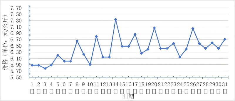 8月,全國重點監(jiān)測農(nóng)產(chǎn)品批發(fā)市場香蕉總交易量達3.4萬噸,同比上漲47.8%,環(huán)比上漲47.8%;總交易價值20902.6萬元,同比上漲44.1%,環(huán)比上漲63.9%。日平均價格最高為7.3元/千克,最低為5.8元/千克,全月平均價格為 6.4元/千克,同比上漲4.9%,環(huán)比上漲8.5%(每日價格變化如圖)。