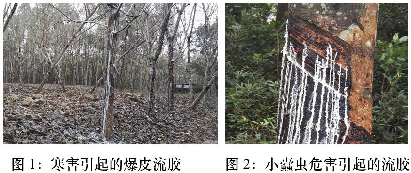 橡膠樹遭遇長期低溫后,葉、枝及樹干均會造成不同程度的損傷,葉片受害初期褪綠變黃,枝條受害干枯,莖干受害后皮層變褐壞死甚至爆皮流膠,嚴重受害會導致膠樹整株枯死。專家建議生產(chǎn)單位于低溫寒潮后盡快組織人力進行膠園寒害情況檢查,及時發(fā)現(xiàn)、處理寒害造成的膠樹枯枝、枯樹和傷樹。其方法主要為:截除橡膠園內(nèi)的枯枝、枯樹,并移到園外集中處理;截后留下的樹樁、樹枝和受傷樹皮可選用敵敵畏乳油、高效氯氟氰菊酯乳油、吡蟲啉可濕性粉劑等藥劑,按推薦濃度噴施預防蟲害。