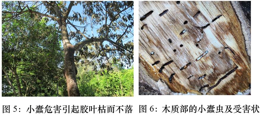小蠹蟲危害后,其受害部位顯現(xiàn)流膠、針錐狀蛀孔、黃褐色木質粉末,嚴重時莖干遍布蛀孔和粉柱、粉末等癥狀。鑒于寒害也會出現(xiàn)膠樹流膠,需注意區(qū)分寒害流膠與蟲害流膠。小蠹蟲危害的流膠部位主要分布于膠樹樹干開割部位及其上下30—50厘米范圍內(nèi),嚴重時才會分布在膠樹其他位置或者未開割膠樹,將膠線拉開,可看到小蠹蟲造成的圓形蛀孔,如果是新蛀的,則可看到水漬狀的圓形蛀點;寒害流膠的部位可分布于膠樹樹干任意位置,甚至是樹枝上,將膠線拉開,可以明顯看出流膠部位出現(xiàn)細小的裂縫或爆皮。