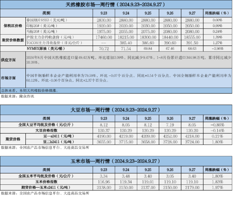 天然橡膠、大豆、玉米市場(chǎng)一周行情(2024.09.23-09.27)