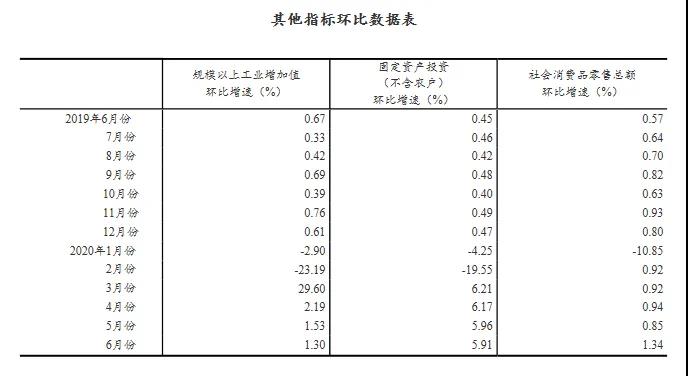 (2)根據(jù)季節(jié)調(diào)整模型自動修正結(jié)果,對近一年來各期國內(nèi)生產(chǎn)總值、規(guī)模以上工業(yè)增加值、固定資產(chǎn)投資(不含農(nóng)戶)、社會消費品零售總額環(huán)比增速進行修訂。修訂結(jié)果及2020年二季度GDP環(huán)比數(shù)據(jù)、2020年6月份其他指標環(huán)比數(shù)據(jù)如下:2019年各季度及2020年一季度、二季度GDP環(huán)比增速分別為2.0%、1.2%、1.4%、1.3%、-10.0%、11.5%。