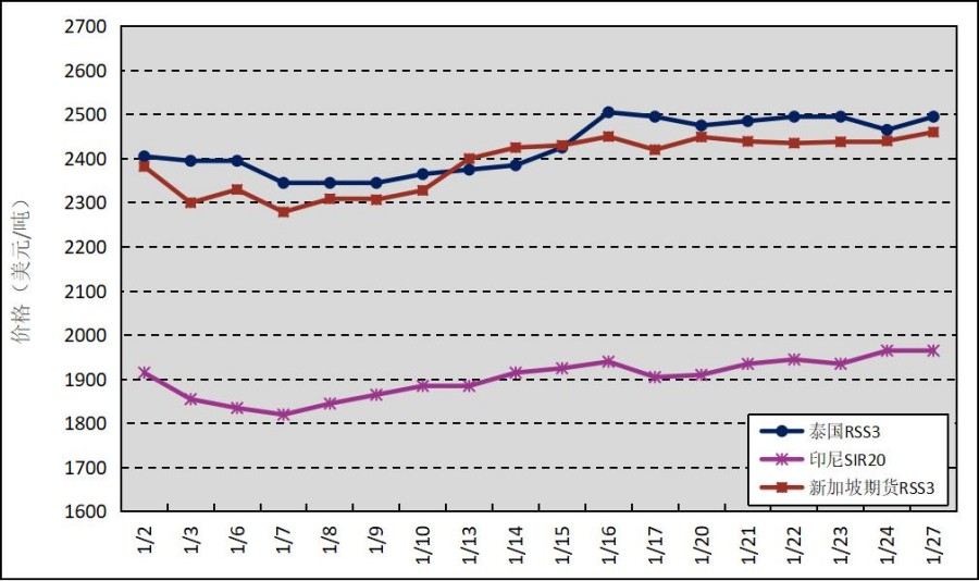 國外主產(chǎn)區(qū):1月,泰國RSS3平均價(jià)格為2427美元/噸,環(huán)比下跌30美元/噸,最高價(jià)為2505美元/噸,最低價(jià)為2345美元/噸;印尼SIR20平均價(jià)格為1903美元/噸,環(huán)比下跌63美元/噸,最高價(jià)為1965美元/噸,最低價(jià)為1820美元/噸;新加坡RSS3期貨主力合約月均結(jié)算價(jià)格為2390美元/噸,環(huán)比下跌34美元/噸,最高價(jià)為2460美元/噸,最低價(jià)為2279美元/噸。