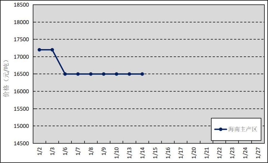 國內(nèi)主產(chǎn)區(qū):1月中旬,海南產(chǎn)區(qū)停割,至此國內(nèi)膠園全部進(jìn)入停割期。海南原料膠(折干膠)月均價(jià)格為16656元/噸,環(huán)比下跌626元/噸。