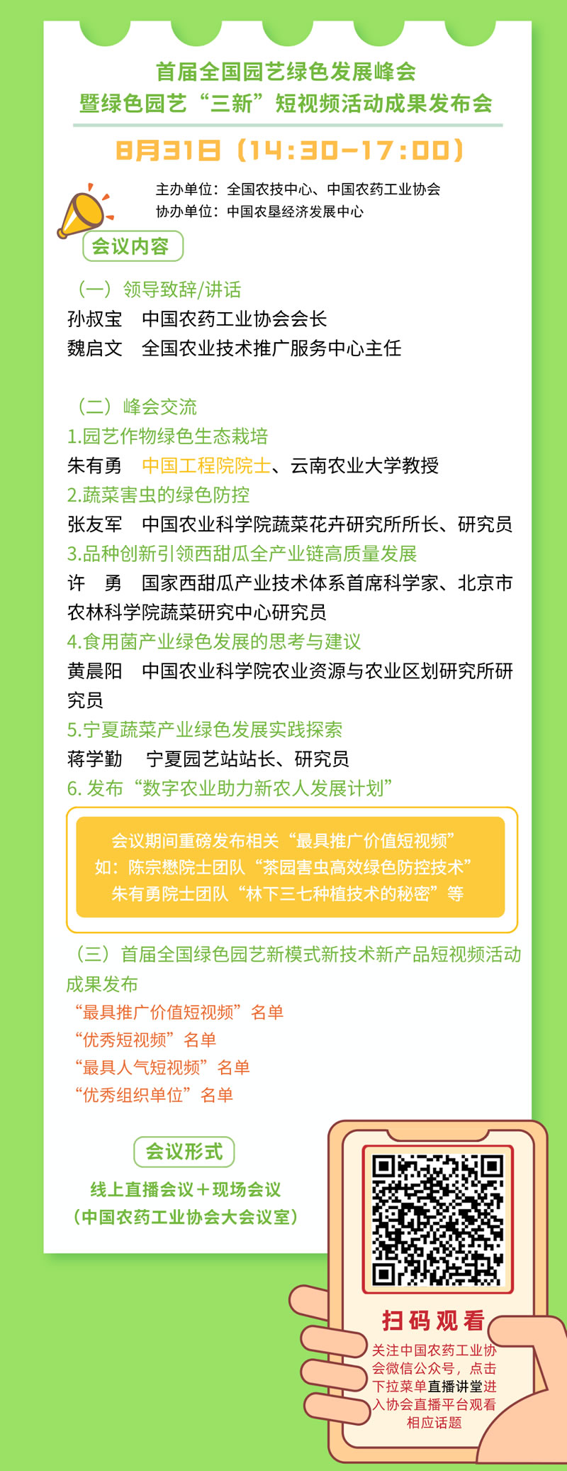 為深入貫徹落實綠色發(fā)展理念,用新方式推廣園藝綠色生產(chǎn)新模式、新技術(shù)、新產(chǎn)品,助推提高園藝產(chǎn)業(yè)質(zhì)量效益與競爭力和保障重要農(nóng)產(chǎn)品有效供給,全國農(nóng)技中心會同中國農(nóng)藥工業(yè)協(xié)會聯(lián)合舉辦首屆全國綠色園藝新模式新技術(shù)新產(chǎn)品(以下簡稱“三新”)短視頻學(xué)習(xí)交流活動。各地農(nóng)技部門、科研教學(xué)單位園藝生產(chǎn)主體和農(nóng)資服務(wù)主體等積極參加,共制作了300多個“三新”短視頻用于學(xué)習(xí)交流,活動組委會從中推評出了一批最具推廣價值短視頻和優(yōu)秀短視頻。為進(jìn)一步擴(kuò)大活動宣傳覆蓋面,中國農(nóng)藥工業(yè)協(xié)會將于2021年8月31日以線上直播形式舉辦首屆全國園藝綠色發(fā)展峰會暨“三新”短視頻學(xué)習(xí)交流活動成果發(fā)布會。