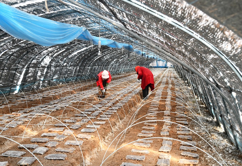 為了達到增溫保濕的效果,基地的工作人員在揭開地膜后,便將塑料纖維棒插入土地,在畦面上搭建起一座座堅固的小拱棚。