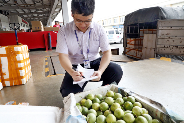 工作人員正在對百香果開箱檢查。黃求玉攝