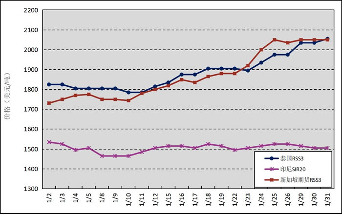 國外主產(chǎn)區(qū):1月,泰國RSS3平均價(jià)格為1885美元/噸,環(huán)比上漲158美元/噸,最高價(jià)為2055美元/噸,最低價(jià)為1785美元/噸;印尼SIR20平均價(jià)格為1505美元/噸,環(huán)比上漲71美元/噸,最高價(jià)為1535美元/噸,最低價(jià)為1465美元/噸;新加坡RSS3期貨主力合約月均結(jié)算價(jià)格為1870美元/噸,環(huán)比上漲182美元/噸,最高價(jià)為2050美元/噸,最低價(jià)為1731美元/噸。