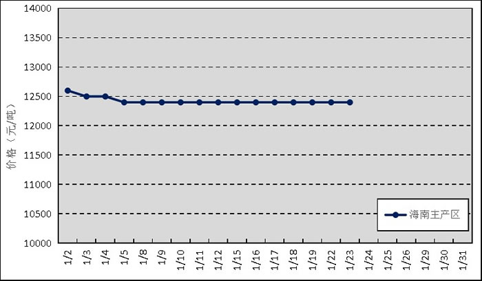 國內(nèi)主產(chǎn)區(qū):1月中下旬,海南產(chǎn)區(qū)全面停割,至此國內(nèi)膠園全部進(jìn)入停割期。海南原料膠(折干膠)月均價(jià)格為12425元/噸,環(huán)比上漲158元/噸。
